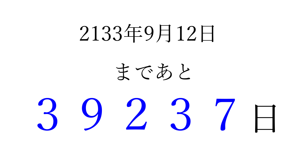 2133年9月12日(土)まで あと 99999 日です 追加すると、トップページからすぐ選べるようになります ※2026/04/09現在の結果です。 最新の状態に更新する ↓シェアして、タイムライン上にカウントダウンを表示しよう!↓ 📤 この結果を共有する Tweet シェア Threads Bluesky 別の日付でカウントダウン 2133年9月のカレンダー このページをブックマークに追加すると、いつでもカウントダウンを確認できます。 (PC: Ctrl+D / Mac: ⌘+D) hitome-notes.comでは以下のページも運営しています。 指定日と期間から日付を計算 | ガチャ確率計算・シミュレーション | プライバシー・ポリシー 運営者:Avocado