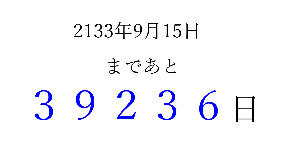 2133年9月15日(火)まで あと 99999 日です 追加すると、トップページからすぐ選べるようになります ※2026/04/13現在の結果です。 最新の状態に更新する ↓シェアして、タイムライン上にカウントダウンを表示しよう!↓ 📤 この結果を共有する Tweet シェア Threads Bluesky 別の日付でカウントダウン 2133年9月のカレンダー このページをブックマークに追加すると、いつでもカウントダウンを確認できます。 (PC: Ctrl+D / Mac: ⌘+D) hitome-notes.comでは以下のページも運営しています。 指定日と期間から日付を計算 | ガチャ確率計算・シミュレーション | プライバシー・ポリシー 運営者:Avocado