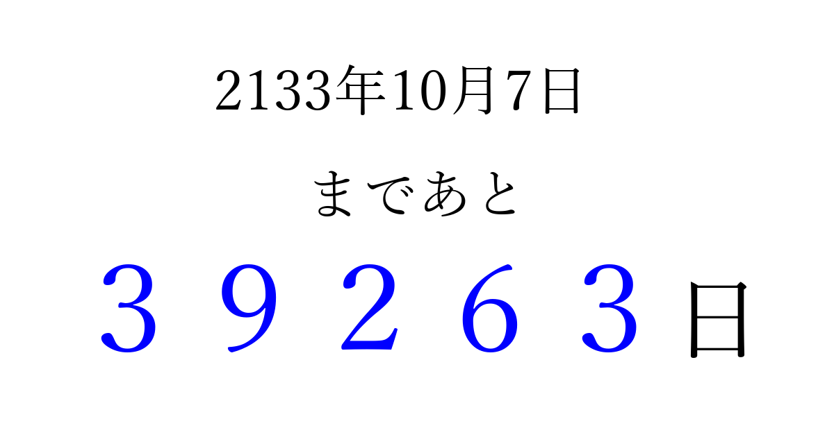 2133年10月7日(水)まで あと 99999 日です 追加すると、トップページからすぐ選べるようになります ※2026/04/08現在の結果です。 最新の状態に更新する ↓シェアして、タイムライン上にカウントダウンを表示しよう!↓ 📤 この結果を共有する Tweet シェア Threads Bluesky 別の日付でカウントダウン 2133年10月のカレンダー このページをブックマークに追加すると、いつでもカウントダウンを確認できます。 (PC: Ctrl+D / Mac: ⌘+D) hitome-notes.comでは以下のページも運営しています。 指定日と期間から日付を計算 | ガチャ確率計算・シミュレーション | プライバシー・ポリシー 運営者:Avocado