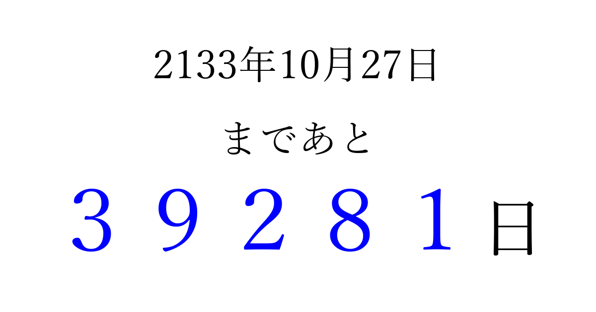 2133年10月27日(火)まで あと 99999 日です 追加すると、トップページからすぐ選べるようになります ※2026/04/10現在の結果です。 最新の状態に更新する ↓シェアして、タイムライン上にカウントダウンを表示しよう!↓ 📤 この結果を共有する Tweet シェア Threads Bluesky 別の日付でカウントダウン 2133年10月のカレンダー このページをブックマークに追加すると、いつでもカウントダウンを確認できます。 (PC: Ctrl+D / Mac: ⌘+D) hitome-notes.comでは以下のページも運営しています。 指定日と期間から日付を計算 | ガチャ確率計算・シミュレーション | プライバシー・ポリシー 運営者:Avocado