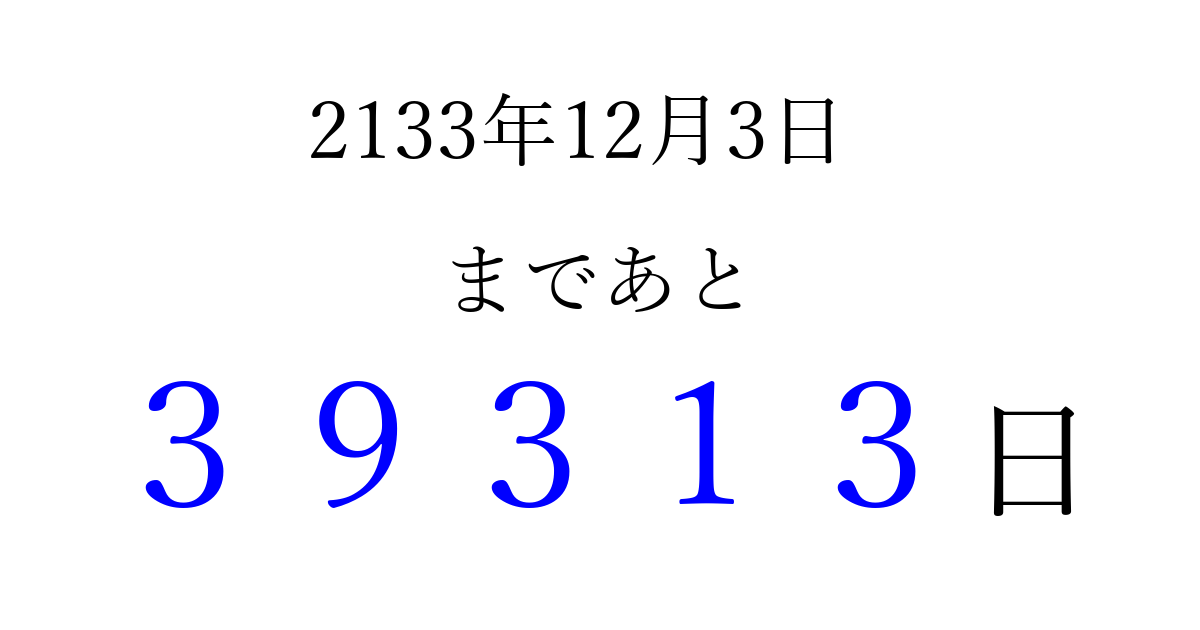 2133年12月3日(木)まで あと 99999 日です 追加すると、トップページからすぐ選べるようになります ※2026/04/15現在の結果です。 最新の状態に更新する ↓シェアして、タイムライン上にカウントダウンを表示しよう!↓ 📤 この結果を共有する Tweet シェア Threads Bluesky 別の日付でカウントダウン 2133年12月のカレンダー このページをブックマークに追加すると、いつでもカウントダウンを確認できます。 (PC: Ctrl+D / Mac: ⌘+D) hitome-notes.comでは以下のページも運営しています。 指定日と期間から日付を計算 | ガチャ確率計算・シミュレーション | プライバシー・ポリシー 運営者:Avocado