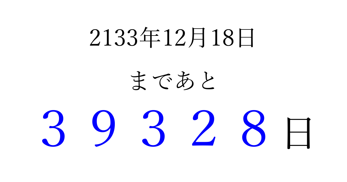 2133年12月18日(金)まで あと 99999 日です 追加すると、トップページからすぐ選べるようになります ※2026/04/15現在の結果です。 最新の状態に更新する ↓シェアして、タイムライン上にカウントダウンを表示しよう!↓ 📤 この結果を共有する Tweet シェア Threads Bluesky 別の日付でカウントダウン 2133年12月のカレンダー このページをブックマークに追加すると、いつでもカウントダウンを確認できます。 (PC: Ctrl+D / Mac: ⌘+D) hitome-notes.comでは以下のページも運営しています。 指定日と期間から日付を計算 | ガチャ確率計算・シミュレーション | プライバシー・ポリシー 運営者:Avocado