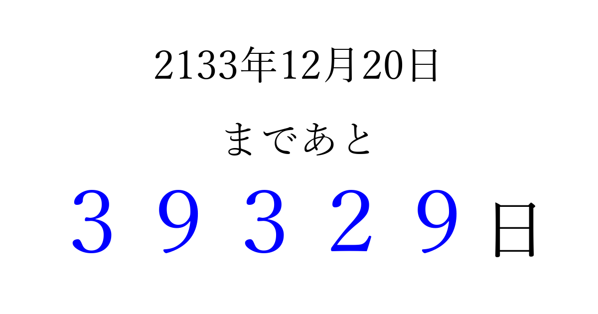 2133年12月20日(日)まで あと 99999 日です 追加すると、トップページからすぐ選べるようになります ※2026/04/16現在の結果です。 最新の状態に更新する ↓シェアして、タイムライン上にカウントダウンを表示しよう!↓ 📤 この結果を共有する Tweet シェア Threads Bluesky 別の日付でカウントダウン 2133年12月のカレンダー このページをブックマークに追加すると、いつでもカウントダウンを確認できます。 (PC: Ctrl+D / Mac: ⌘+D) hitome-notes.comでは以下のページも運営しています。 指定日と期間から日付を計算 | ガチャ確率計算・シミュレーション | プライバシー・ポリシー 運営者:Avocado