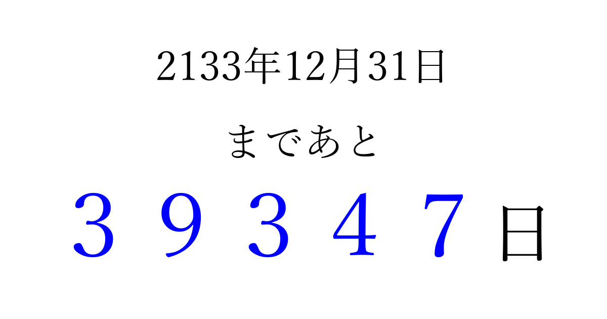 2133年12月31日(木)まで あと 99999 日です 追加すると、トップページからすぐ選べるようになります ※2026/04/09現在の結果です。 最新の状態に更新する ↓シェアして、タイムライン上にカウントダウンを表示しよう!↓ 📤 この結果を共有する Tweet シェア Threads Bluesky 別の日付でカウントダウン 2133年12月のカレンダー このページをブックマークに追加すると、いつでもカウントダウンを確認できます。 (PC: Ctrl+D / Mac: ⌘+D) hitome-notes.comでは以下のページも運営しています。 指定日と期間から日付を計算 | ガチャ確率計算・シミュレーション | プライバシー・ポリシー 運営者:Avocado