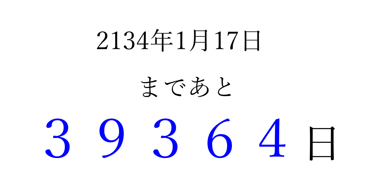 2134年1月17日(日)まで あと 99999 日です 追加すると、トップページからすぐ選べるようになります ※2026/04/09現在の結果です。 最新の状態に更新する ↓シェアして、タイムライン上にカウントダウンを表示しよう!↓ 📤 この結果を共有する Tweet シェア Threads Bluesky 別の日付でカウントダウン 2134年1月のカレンダー このページをブックマークに追加すると、いつでもカウントダウンを確認できます。 (PC: Ctrl+D / Mac: ⌘+D) hitome-notes.comでは以下のページも運営しています。 指定日と期間から日付を計算 | ガチャ確率計算・シミュレーション | プライバシー・ポリシー 運営者:Avocado