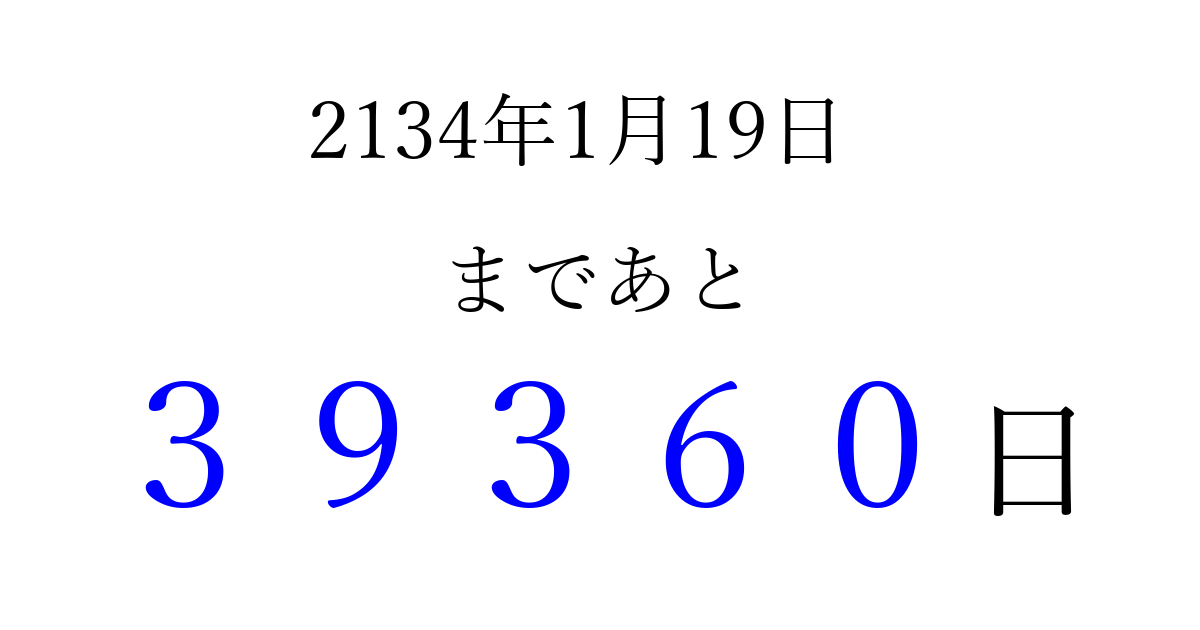 2134年1月19日(火)まで あと 99999 日です 追加すると、トップページからすぐ選べるようになります ※2026/04/15現在の結果です。 最新の状態に更新する ↓シェアして、タイムライン上にカウントダウンを表示しよう!↓ 📤 この結果を共有する Tweet シェア Threads Bluesky 別の日付でカウントダウン 2134年1月のカレンダー このページをブックマークに追加すると、いつでもカウントダウンを確認できます。 (PC: Ctrl+D / Mac: ⌘+D) hitome-notes.comでは以下のページも運営しています。 指定日と期間から日付を計算 | ガチャ確率計算・シミュレーション | プライバシー・ポリシー 運営者:Avocado