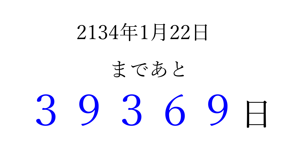 2134年1月22日(金)まで あと 99999 日です 追加すると、トップページからすぐ選べるようになります ※2026/04/09現在の結果です。 最新の状態に更新する ↓シェアして、タイムライン上にカウントダウンを表示しよう!↓ 📤 この結果を共有する Tweet シェア Threads Bluesky 別の日付でカウントダウン 2134年1月のカレンダー このページをブックマークに追加すると、いつでもカウントダウンを確認できます。 (PC: Ctrl+D / Mac: ⌘+D) hitome-notes.comでは以下のページも運営しています。 指定日と期間から日付を計算 | ガチャ確率計算・シミュレーション | プライバシー・ポリシー 運営者:Avocado