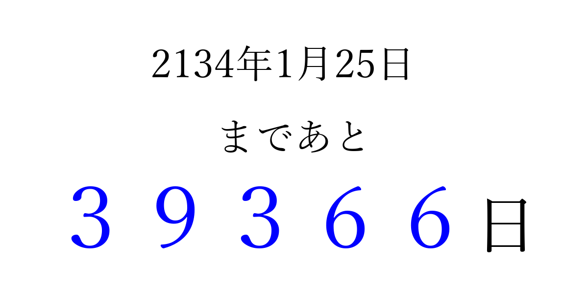 2134年1月25日(月)まで あと 99999 日です 追加すると、トップページからすぐ選べるようになります ※2026/04/15現在の結果です。 最新の状態に更新する ↓シェアして、タイムライン上にカウントダウンを表示しよう!↓ 📤 この結果を共有する Tweet シェア Threads Bluesky 別の日付でカウントダウン 2134年1月のカレンダー このページをブックマークに追加すると、いつでもカウントダウンを確認できます。 (PC: Ctrl+D / Mac: ⌘+D) hitome-notes.comでは以下のページも運営しています。 指定日と期間から日付を計算 | ガチャ確率計算・シミュレーション | プライバシー・ポリシー 運営者:Avocado