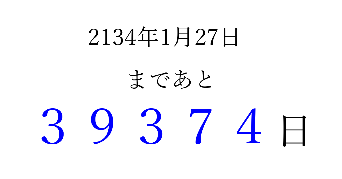 2134年1月27日(水)まで あと 99999 日です 追加すると、トップページからすぐ選べるようになります ※2026/04/09現在の結果です。 最新の状態に更新する ↓シェアして、タイムライン上にカウントダウンを表示しよう!↓ 📤 この結果を共有する Tweet シェア Threads Bluesky 別の日付でカウントダウン 2134年1月のカレンダー このページをブックマークに追加すると、いつでもカウントダウンを確認できます。 (PC: Ctrl+D / Mac: ⌘+D) hitome-notes.comでは以下のページも運営しています。 指定日と期間から日付を計算 | ガチャ確率計算・シミュレーション | プライバシー・ポリシー 運営者:Avocado