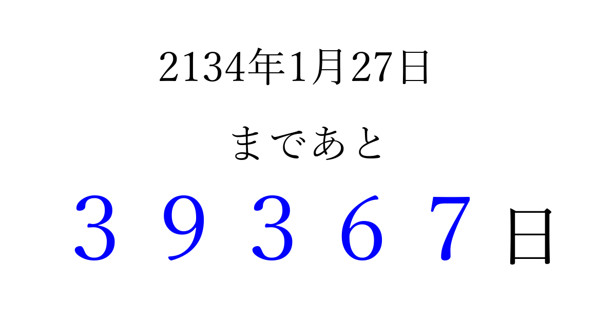 2134年1月27日(水)まで あと 99999 日です 追加すると、トップページからすぐ選べるようになります ※2026/04/16現在の結果です。 最新の状態に更新する ↓シェアして、タイムライン上にカウントダウンを表示しよう!↓ 📤 この結果を共有する Tweet シェア Threads Bluesky 別の日付でカウントダウン 2134年1月のカレンダー このページをブックマークに追加すると、いつでもカウントダウンを確認できます。 (PC: Ctrl+D / Mac: ⌘+D) hitome-notes.comでは以下のページも運営しています。 指定日と期間から日付を計算 | ガチャ確率計算・シミュレーション | プライバシー・ポリシー 運営者:Avocado