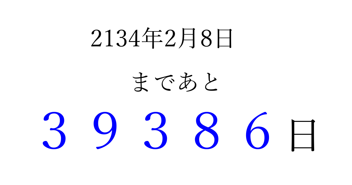 2134年2月8日(月)まで あと 99999 日です 追加すると、トップページからすぐ選べるようになります ※2026/04/09現在の結果です。 最新の状態に更新する ↓シェアして、タイムライン上にカウントダウンを表示しよう!↓ 📤 この結果を共有する Tweet シェア Threads Bluesky 別の日付でカウントダウン 2134年2月のカレンダー このページをブックマークに追加すると、いつでもカウントダウンを確認できます。 (PC: Ctrl+D / Mac: ⌘+D) hitome-notes.comでは以下のページも運営しています。 指定日と期間から日付を計算 | ガチャ確率計算・シミュレーション | プライバシー・ポリシー 運営者:Avocado