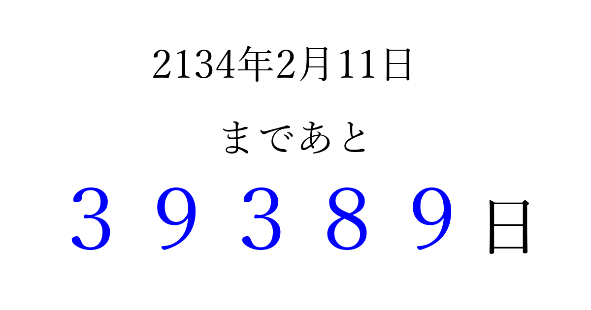 2134年2月11日(木)まで あと 99999 日です 追加すると、トップページからすぐ選べるようになります ※2026/04/09現在の結果です。 最新の状態に更新する ↓シェアして、タイムライン上にカウントダウンを表示しよう!↓ 📤 この結果を共有する Tweet シェア Threads Bluesky 別の日付でカウントダウン 2134年2月のカレンダー このページをブックマークに追加すると、いつでもカウントダウンを確認できます。 (PC: Ctrl+D / Mac: ⌘+D) hitome-notes.comでは以下のページも運営しています。 指定日と期間から日付を計算 | ガチャ確率計算・シミュレーション | プライバシー・ポリシー 運営者:Avocado
