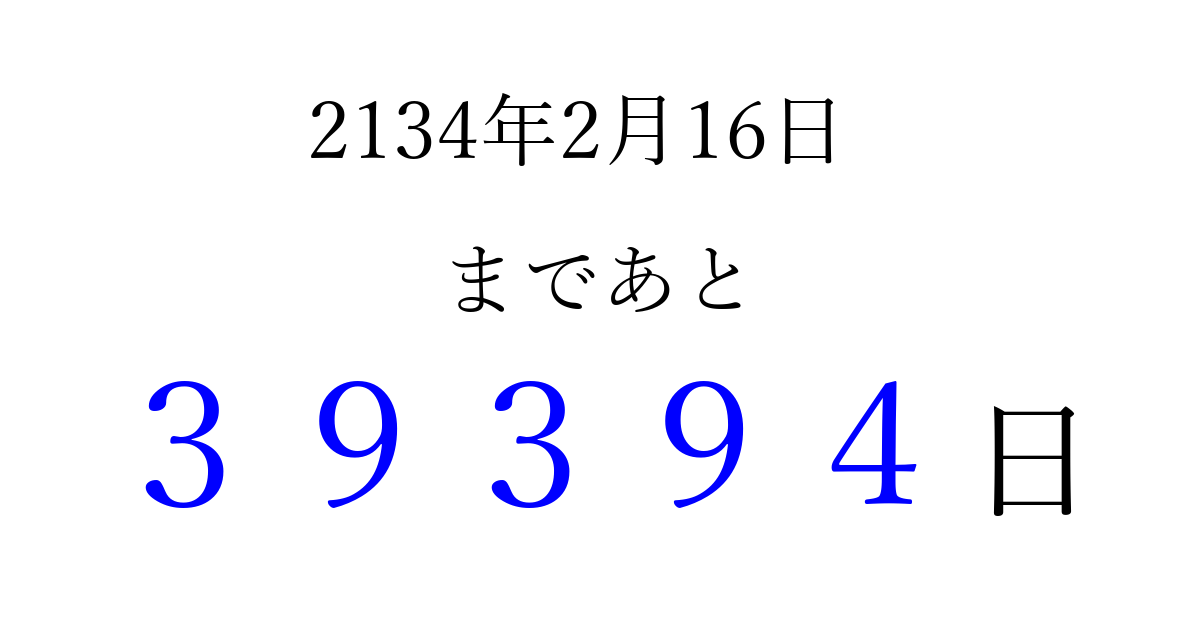 2134年2月16日(火)まで あと 99999 日です 追加すると、トップページからすぐ選べるようになります ※2026/04/09現在の結果です。 最新の状態に更新する ↓シェアして、タイムライン上にカウントダウンを表示しよう!↓ 📤 この結果を共有する Tweet シェア Threads Bluesky 別の日付でカウントダウン 2134年2月のカレンダー このページをブックマークに追加すると、いつでもカウントダウンを確認できます。 (PC: Ctrl+D / Mac: ⌘+D) hitome-notes.comでは以下のページも運営しています。 指定日と期間から日付を計算 | ガチャ確率計算・シミュレーション | プライバシー・ポリシー 運営者:Avocado