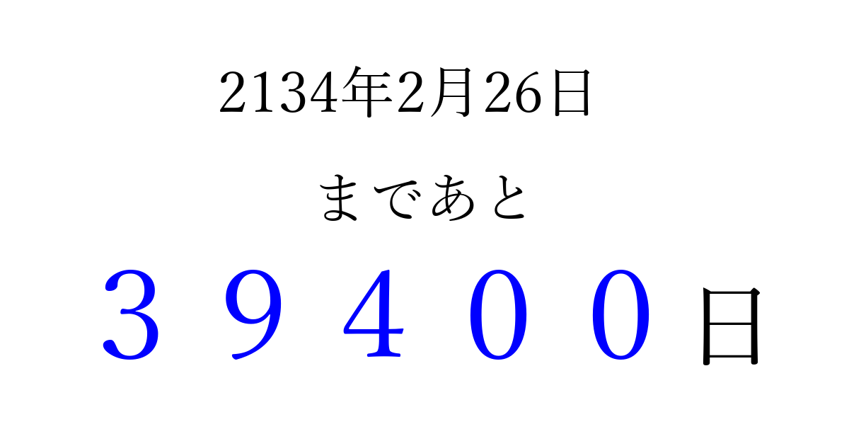 2134年2月26日(金)まで あと 99999 日です 追加すると、トップページからすぐ選べるようになります ※2026/04/13現在の結果です。 最新の状態に更新する ↓シェアして、タイムライン上にカウントダウンを表示しよう!↓ 📤 この結果を共有する Tweet シェア Threads Bluesky 別の日付でカウントダウン 2134年2月のカレンダー このページをブックマークに追加すると、いつでもカウントダウンを確認できます。 (PC: Ctrl+D / Mac: ⌘+D) hitome-notes.comでは以下のページも運営しています。 指定日と期間から日付を計算 | ガチャ確率計算・シミュレーション | プライバシー・ポリシー 運営者:Avocado