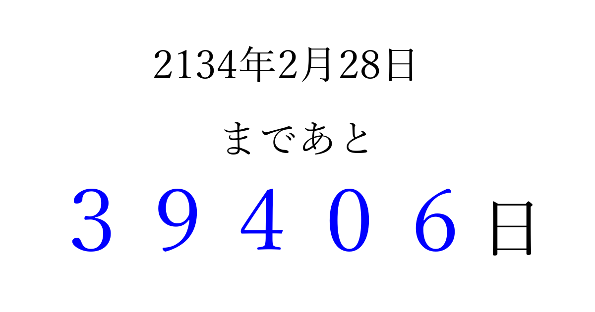 2134年2月28日(日)まで あと 99999 日です 追加すると、トップページからすぐ選べるようになります ※2026/04/09現在の結果です。 最新の状態に更新する ↓シェアして、タイムライン上にカウントダウンを表示しよう!↓ 📤 この結果を共有する Tweet シェア Threads Bluesky 別の日付でカウントダウン 2134年2月のカレンダー このページをブックマークに追加すると、いつでもカウントダウンを確認できます。 (PC: Ctrl+D / Mac: ⌘+D) hitome-notes.comでは以下のページも運営しています。 指定日と期間から日付を計算 | ガチャ確率計算・シミュレーション | プライバシー・ポリシー 運営者:Avocado