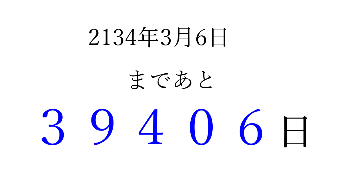 2134年3月6日(土)まで あと 99999 日です 追加すると、トップページからすぐ選べるようになります ※2026/04/15現在の結果です。 最新の状態に更新する ↓シェアして、タイムライン上にカウントダウンを表示しよう!↓ 📤 この結果を共有する Tweet シェア Threads Bluesky 別の日付でカウントダウン 2134年3月のカレンダー このページをブックマークに追加すると、いつでもカウントダウンを確認できます。 (PC: Ctrl+D / Mac: ⌘+D) hitome-notes.comでは以下のページも運営しています。 指定日と期間から日付を計算 | ガチャ確率計算・シミュレーション | プライバシー・ポリシー 運営者:Avocado