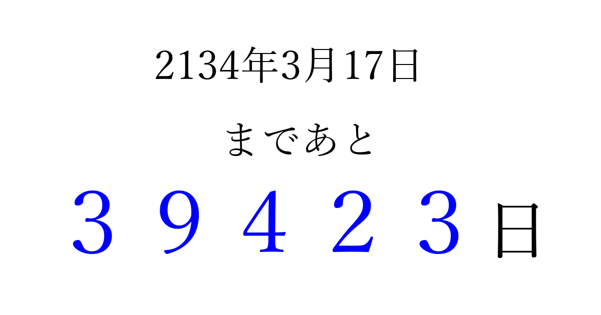 2134年3月17日(水)まで あと 99999 日です 追加すると、トップページからすぐ選べるようになります ※2026/04/09現在の結果です。 最新の状態に更新する ↓シェアして、タイムライン上にカウントダウンを表示しよう!↓ 📤 この結果を共有する Tweet シェア Threads Bluesky 別の日付でカウントダウン 2134年3月のカレンダー このページをブックマークに追加すると、いつでもカウントダウンを確認できます。 (PC: Ctrl+D / Mac: ⌘+D) hitome-notes.comでは以下のページも運営しています。 指定日と期間から日付を計算 | ガチャ確率計算・シミュレーション | プライバシー・ポリシー 運営者:Avocado