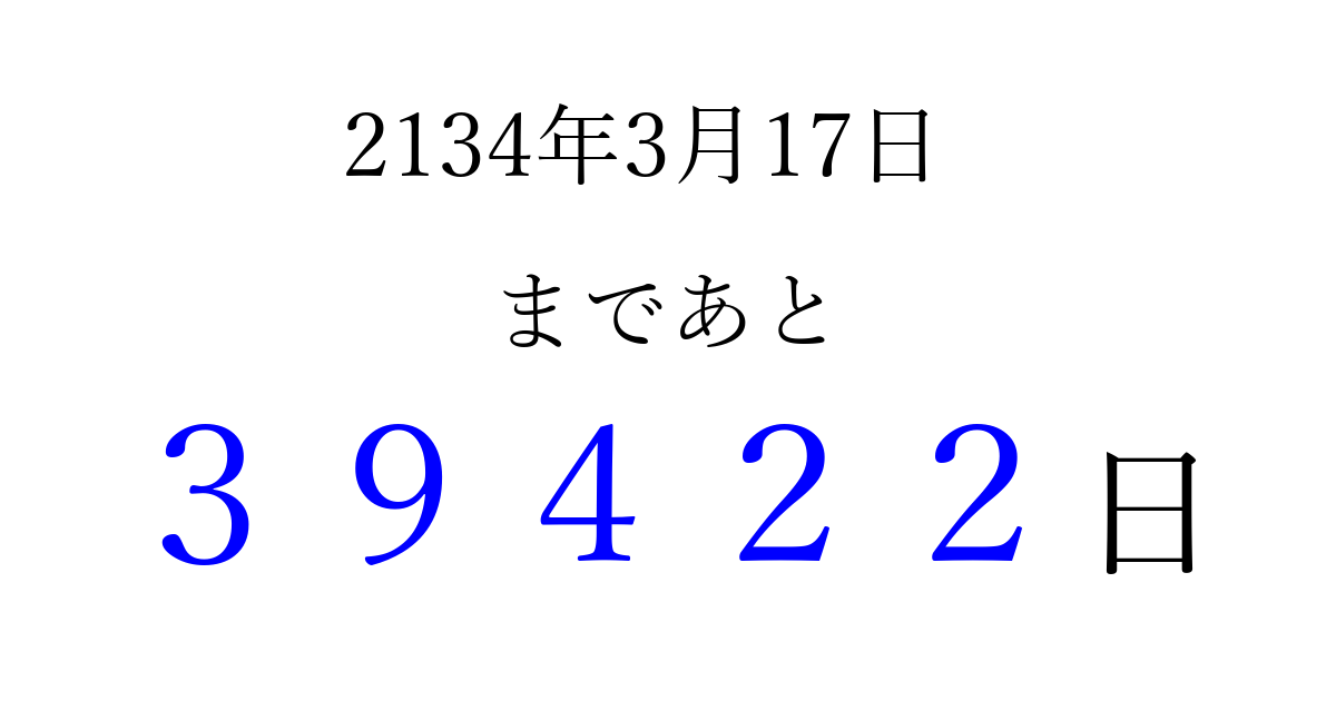 2134年3月17日(水)まで あと 99999 日です 追加すると、トップページからすぐ選べるようになります ※2026/04/10現在の結果です。 最新の状態に更新する ↓シェアして、タイムライン上にカウントダウンを表示しよう!↓ 📤 この結果を共有する Tweet シェア Threads Bluesky 別の日付でカウントダウン 2134年3月のカレンダー このページをブックマークに追加すると、いつでもカウントダウンを確認できます。 (PC: Ctrl+D / Mac: ⌘+D) hitome-notes.comでは以下のページも運営しています。 指定日と期間から日付を計算 | ガチャ確率計算・シミュレーション | プライバシー・ポリシー 運営者:Avocado