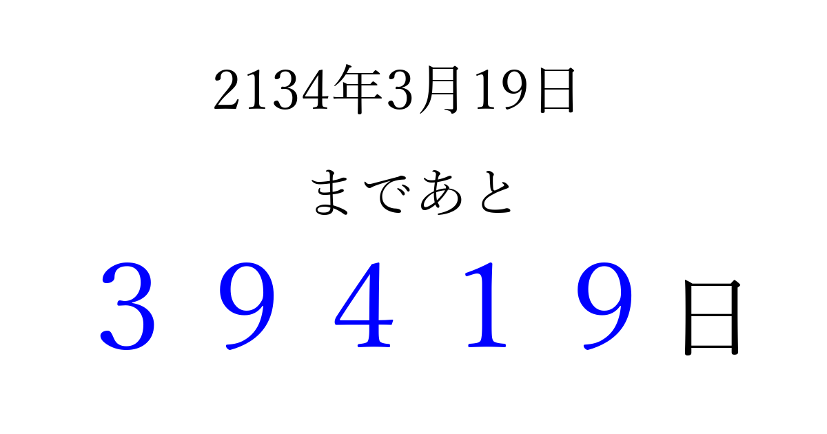 2134年3月19日(金)まで あと 99999 日です 追加すると、トップページからすぐ選べるようになります ※2026/04/15現在の結果です。 最新の状態に更新する ↓シェアして、タイムライン上にカウントダウンを表示しよう!↓ 📤 この結果を共有する Tweet シェア Threads Bluesky 別の日付でカウントダウン 2134年3月のカレンダー このページをブックマークに追加すると、いつでもカウントダウンを確認できます。 (PC: Ctrl+D / Mac: ⌘+D) hitome-notes.comでは以下のページも運営しています。 指定日と期間から日付を計算 | ガチャ確率計算・シミュレーション | プライバシー・ポリシー 運営者:Avocado