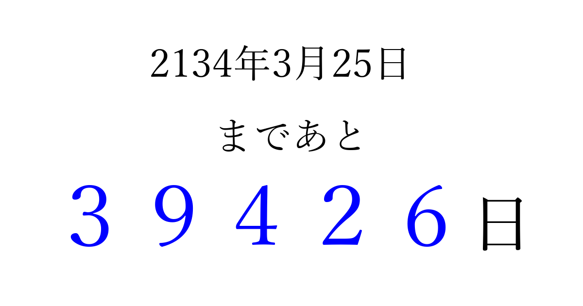 2134年3月25日(木)まで あと 99999 日です 追加すると、トップページからすぐ選べるようになります ※2026/04/14現在の結果です。 最新の状態に更新する ↓シェアして、タイムライン上にカウントダウンを表示しよう!↓ 📤 この結果を共有する Tweet シェア Threads Bluesky 別の日付でカウントダウン 2134年3月のカレンダー このページをブックマークに追加すると、いつでもカウントダウンを確認できます。 (PC: Ctrl+D / Mac: ⌘+D) hitome-notes.comでは以下のページも運営しています。 指定日と期間から日付を計算 | ガチャ確率計算・シミュレーション | プライバシー・ポリシー 運営者:Avocado