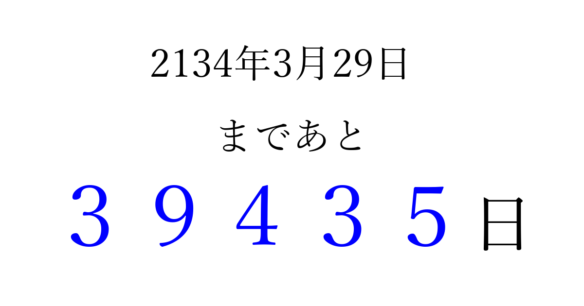 2134年3月29日(月)まで あと 99999 日です 追加すると、トップページからすぐ選べるようになります ※2026/04/09現在の結果です。 最新の状態に更新する ↓シェアして、タイムライン上にカウントダウンを表示しよう!↓ 📤 この結果を共有する Tweet シェア Threads Bluesky 別の日付でカウントダウン 2134年3月のカレンダー このページをブックマークに追加すると、いつでもカウントダウンを確認できます。 (PC: Ctrl+D / Mac: ⌘+D) hitome-notes.comでは以下のページも運営しています。 指定日と期間から日付を計算 | ガチャ確率計算・シミュレーション | プライバシー・ポリシー 運営者:Avocado