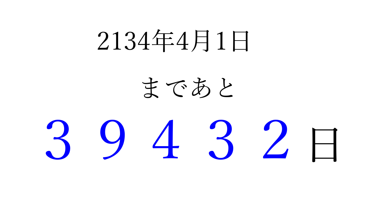 2134年4月1日(木)まで あと 99999 日です 追加すると、トップページからすぐ選べるようになります ※2026/04/15現在の結果です。 最新の状態に更新する ↓シェアして、タイムライン上にカウントダウンを表示しよう!↓ 📤 この結果を共有する Tweet シェア Threads Bluesky 別の日付でカウントダウン 2134年4月のカレンダー このページをブックマークに追加すると、いつでもカウントダウンを確認できます。 (PC: Ctrl+D / Mac: ⌘+D) hitome-notes.comでは以下のページも運営しています。 指定日と期間から日付を計算 | ガチャ確率計算・シミュレーション | プライバシー・ポリシー 運営者:Avocado