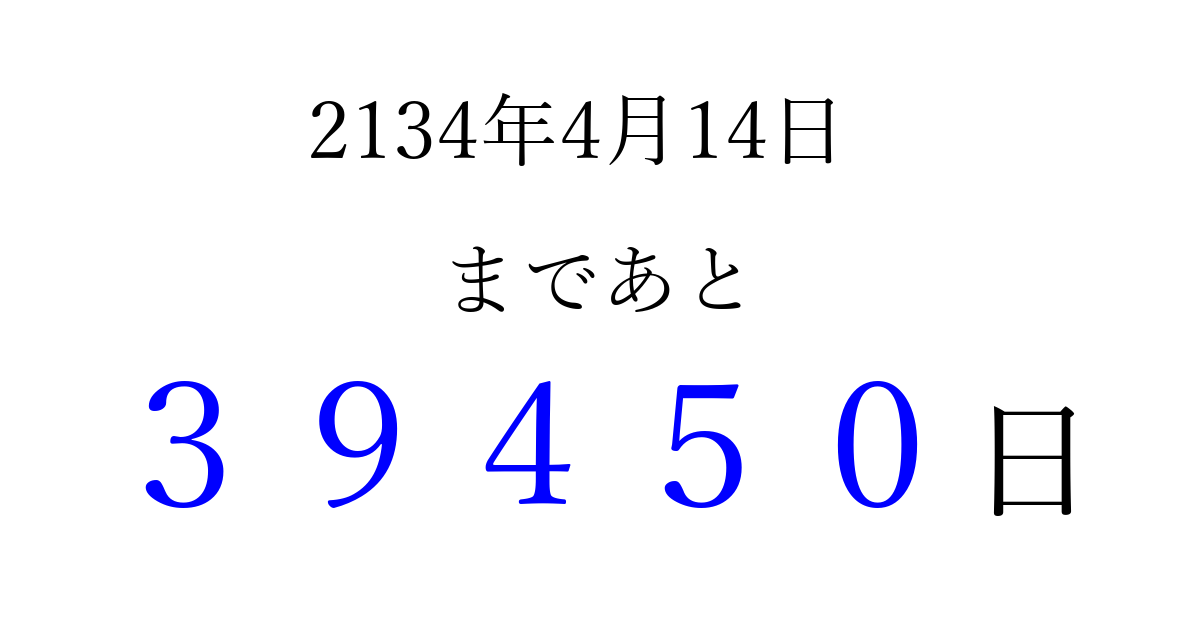 2134年4月14日(水)まで あと 99999 日です 追加すると、トップページからすぐ選べるようになります ※2026/04/10現在の結果です。 最新の状態に更新する ↓シェアして、タイムライン上にカウントダウンを表示しよう!↓ 📤 この結果を共有する Tweet シェア Threads Bluesky 別の日付でカウントダウン 2134年4月のカレンダー このページをブックマークに追加すると、いつでもカウントダウンを確認できます。 (PC: Ctrl+D / Mac: ⌘+D) hitome-notes.comでは以下のページも運営しています。 指定日と期間から日付を計算 | ガチャ確率計算・シミュレーション | プライバシー・ポリシー 運営者:Avocado