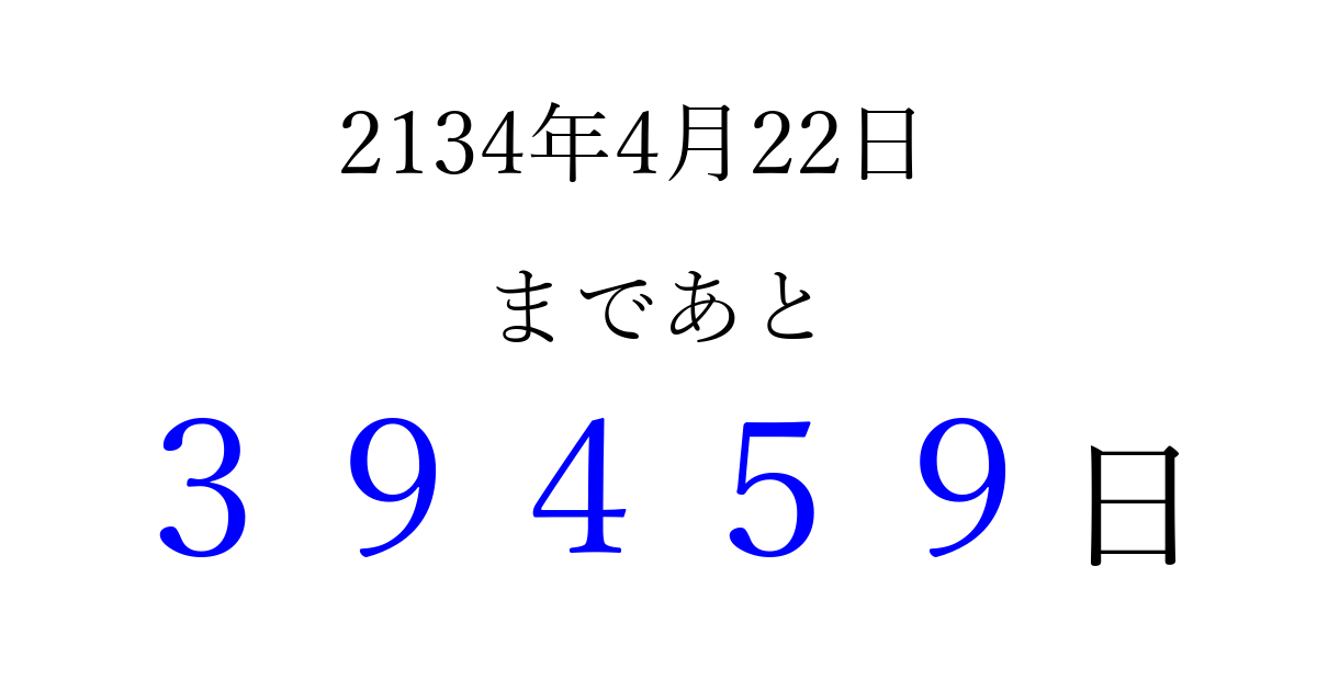 2134年4月22日(木)まで あと 99999 日です 追加すると、トップページからすぐ選べるようになります ※2026/04/09現在の結果です。 最新の状態に更新する ↓シェアして、タイムライン上にカウントダウンを表示しよう!↓ 📤 この結果を共有する Tweet シェア Threads Bluesky 別の日付でカウントダウン 2134年4月のカレンダー このページをブックマークに追加すると、いつでもカウントダウンを確認できます。 (PC: Ctrl+D / Mac: ⌘+D) hitome-notes.comでは以下のページも運営しています。 指定日と期間から日付を計算 | ガチャ確率計算・シミュレーション | プライバシー・ポリシー 運営者:Avocado