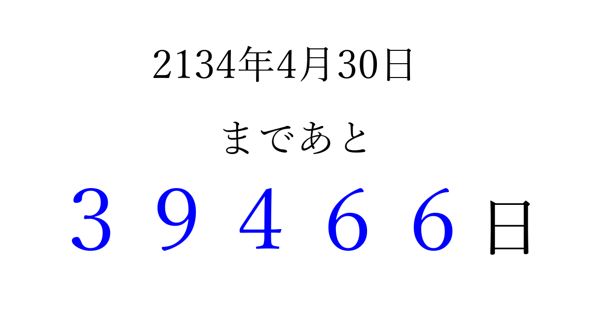 2134年4月30日(金)まで あと 99999 日です 追加すると、トップページからすぐ選べるようになります ※2026/04/10現在の結果です。 最新の状態に更新する ↓シェアして、タイムライン上にカウントダウンを表示しよう!↓ 📤 この結果を共有する Tweet シェア Threads Bluesky 別の日付でカウントダウン 2134年4月のカレンダー このページをブックマークに追加すると、いつでもカウントダウンを確認できます。 (PC: Ctrl+D / Mac: ⌘+D) hitome-notes.comでは以下のページも運営しています。 指定日と期間から日付を計算 | ガチャ確率計算・シミュレーション | プライバシー・ポリシー 運営者:Avocado