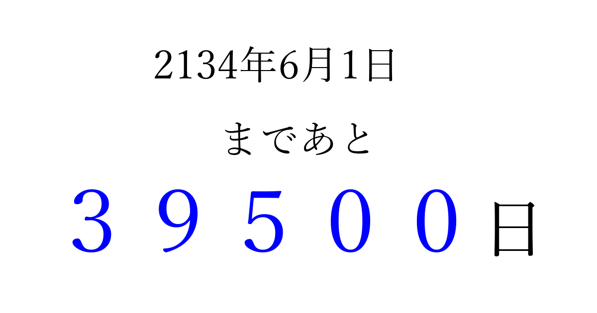 2134年6月1日(火)まで あと 99999 日です 追加すると、トップページからすぐ選べるようになります ※2026/04/08現在の結果です。 最新の状態に更新する ↓シェアして、タイムライン上にカウントダウンを表示しよう!↓ 📤 この結果を共有する Tweet シェア Threads Bluesky 別の日付でカウントダウン 2134年6月のカレンダー このページをブックマークに追加すると、いつでもカウントダウンを確認できます。 (PC: Ctrl+D / Mac: ⌘+D) hitome-notes.comでは以下のページも運営しています。 指定日と期間から日付を計算 | ガチャ確率計算・シミュレーション | プライバシー・ポリシー 運営者:Avocado