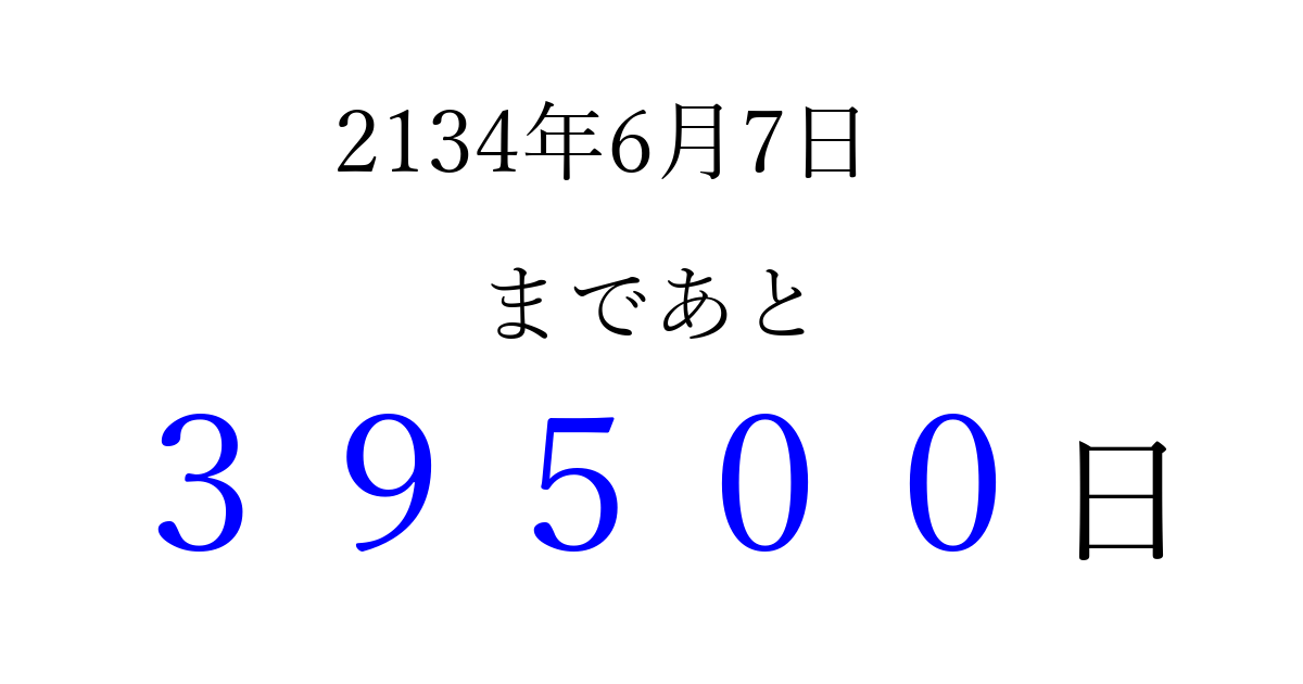 2134年6月7日(月)まで あと 99999 日です 追加すると、トップページからすぐ選べるようになります ※2026/04/14現在の結果です。 最新の状態に更新する ↓シェアして、タイムライン上にカウントダウンを表示しよう!↓ 📤 この結果を共有する Tweet シェア Threads Bluesky 別の日付でカウントダウン 2134年6月のカレンダー このページをブックマークに追加すると、いつでもカウントダウンを確認できます。 (PC: Ctrl+D / Mac: ⌘+D) hitome-notes.comでは以下のページも運営しています。 指定日と期間から日付を計算 | ガチャ確率計算・シミュレーション | プライバシー・ポリシー 運営者:Avocado