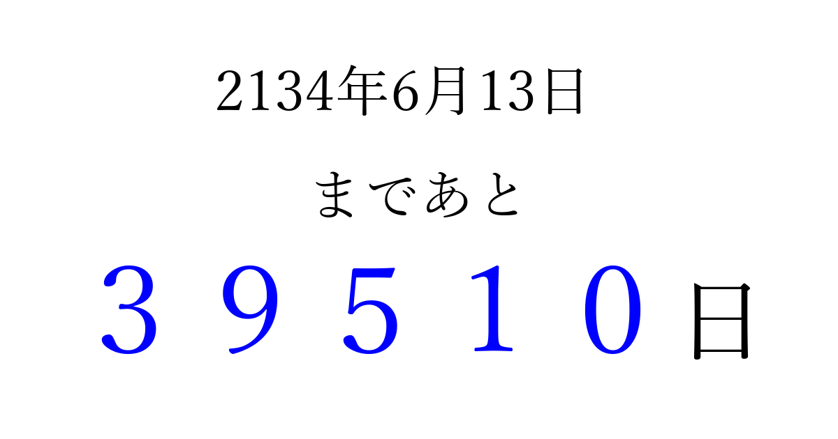 2134年6月13日(日)まで あと 99999 日です 追加すると、トップページからすぐ選べるようになります ※2026/04/10現在の結果です。 最新の状態に更新する ↓シェアして、タイムライン上にカウントダウンを表示しよう!↓ 📤 この結果を共有する Tweet シェア Threads Bluesky 別の日付でカウントダウン 2134年6月のカレンダー このページをブックマークに追加すると、いつでもカウントダウンを確認できます。 (PC: Ctrl+D / Mac: ⌘+D) hitome-notes.comでは以下のページも運営しています。 指定日と期間から日付を計算 | ガチャ確率計算・シミュレーション | プライバシー・ポリシー 運営者:Avocado
