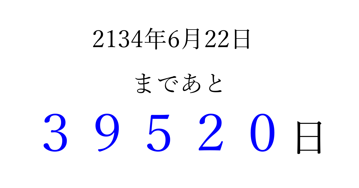 2134年6月22日(火)まで あと 99999 日です 追加すると、トップページからすぐ選べるようになります ※2026/04/09現在の結果です。 最新の状態に更新する ↓シェアして、タイムライン上にカウントダウンを表示しよう!↓ 📤 この結果を共有する Tweet シェア Threads Bluesky 別の日付でカウントダウン 2134年6月のカレンダー このページをブックマークに追加すると、いつでもカウントダウンを確認できます。 (PC: Ctrl+D / Mac: ⌘+D) hitome-notes.comでは以下のページも運営しています。 指定日と期間から日付を計算 | ガチャ確率計算・シミュレーション | プライバシー・ポリシー 運営者:Avocado