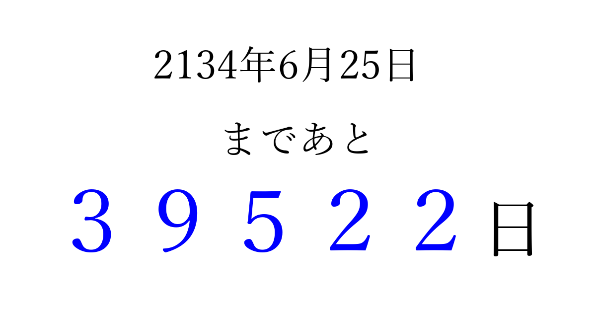 2134年6月25日(金)まで あと 99999 日です 追加すると、トップページからすぐ選べるようになります ※2026/04/10現在の結果です。 最新の状態に更新する ↓シェアして、タイムライン上にカウントダウンを表示しよう!↓ 📤 この結果を共有する Tweet シェア Threads Bluesky 別の日付でカウントダウン 2134年6月のカレンダー このページをブックマークに追加すると、いつでもカウントダウンを確認できます。 (PC: Ctrl+D / Mac: ⌘+D) hitome-notes.comでは以下のページも運営しています。 指定日と期間から日付を計算 | ガチャ確率計算・シミュレーション | プライバシー・ポリシー 運営者:Avocado