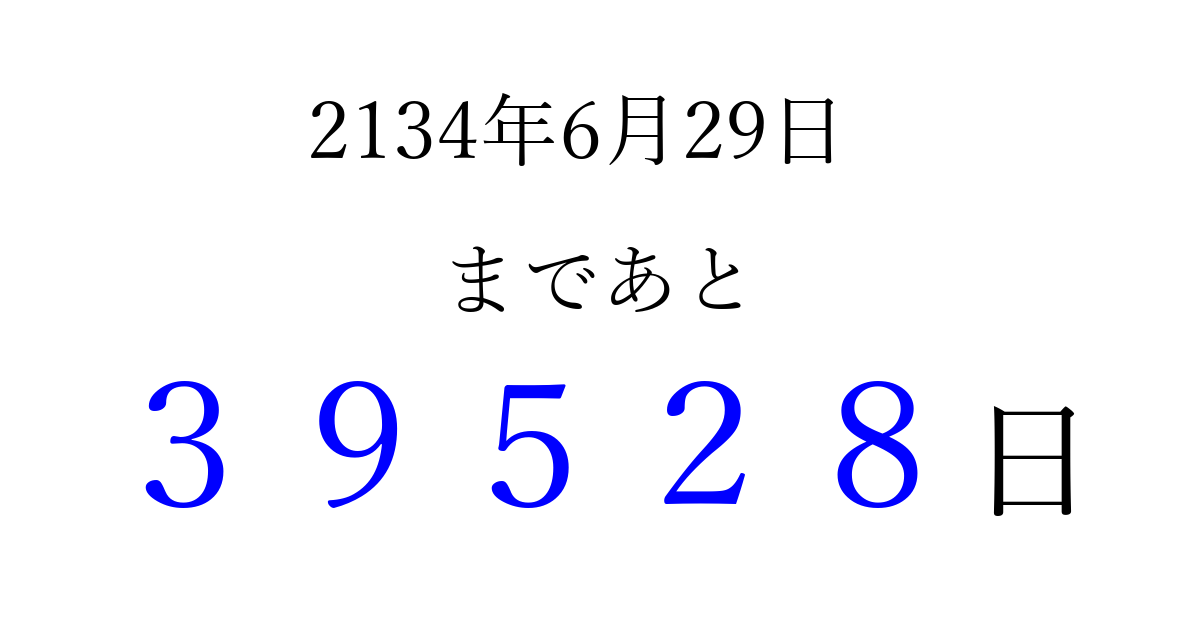 2134年6月29日(火)まで あと 99999 日です 追加すると、トップページからすぐ選べるようになります ※2026/04/08現在の結果です。 最新の状態に更新する ↓シェアして、タイムライン上にカウントダウンを表示しよう!↓ 📤 この結果を共有する Tweet シェア Threads Bluesky 別の日付でカウントダウン 2134年6月のカレンダー このページをブックマークに追加すると、いつでもカウントダウンを確認できます。 (PC: Ctrl+D / Mac: ⌘+D) hitome-notes.comでは以下のページも運営しています。 指定日と期間から日付を計算 | ガチャ確率計算・シミュレーション | プライバシー・ポリシー 運営者:Avocado