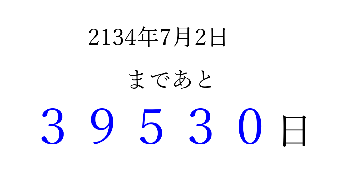 2134年7月2日(金)まで あと 99999 日です 追加すると、トップページからすぐ選べるようになります ※2026/04/09現在の結果です。 最新の状態に更新する ↓シェアして、タイムライン上にカウントダウンを表示しよう!↓ 📤 この結果を共有する Tweet シェア Threads Bluesky 別の日付でカウントダウン 2134年7月のカレンダー このページをブックマークに追加すると、いつでもカウントダウンを確認できます。 (PC: Ctrl+D / Mac: ⌘+D) hitome-notes.comでは以下のページも運営しています。 指定日と期間から日付を計算 | ガチャ確率計算・シミュレーション | プライバシー・ポリシー 運営者:Avocado