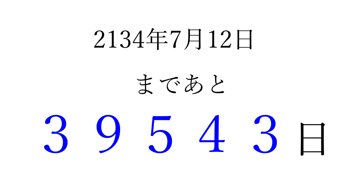 2134年7月12日(月)まで あと 99999 日です 追加すると、トップページからすぐ選べるようになります ※2026/04/06現在の結果です。 最新の状態に更新する ↓シェアして、タイムライン上にカウントダウンを表示しよう!↓ 📤 この結果を共有する Tweet シェア Threads Bluesky 別の日付でカウントダウン 2134年7月のカレンダー このページをブックマークに追加すると、いつでもカウントダウンを確認できます。 (PC: Ctrl+D / Mac: ⌘+D) hitome-notes.comでは以下のページも運営しています。 指定日と期間から日付を計算 | ガチャ確率計算・シミュレーション | プライバシー・ポリシー 運営者:Avocado