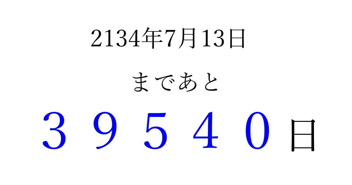2134年7月13日(火)まで あと 99999 日です 追加すると、トップページからすぐ選べるようになります ※2026/04/10現在の結果です。 最新の状態に更新する ↓シェアして、タイムライン上にカウントダウンを表示しよう!↓ 📤 この結果を共有する Tweet シェア Threads Bluesky 別の日付でカウントダウン 2134年7月のカレンダー このページをブックマークに追加すると、いつでもカウントダウンを確認できます。 (PC: Ctrl+D / Mac: ⌘+D) hitome-notes.comでは以下のページも運営しています。 指定日と期間から日付を計算 | ガチャ確率計算・シミュレーション | プライバシー・ポリシー 運営者:Avocado