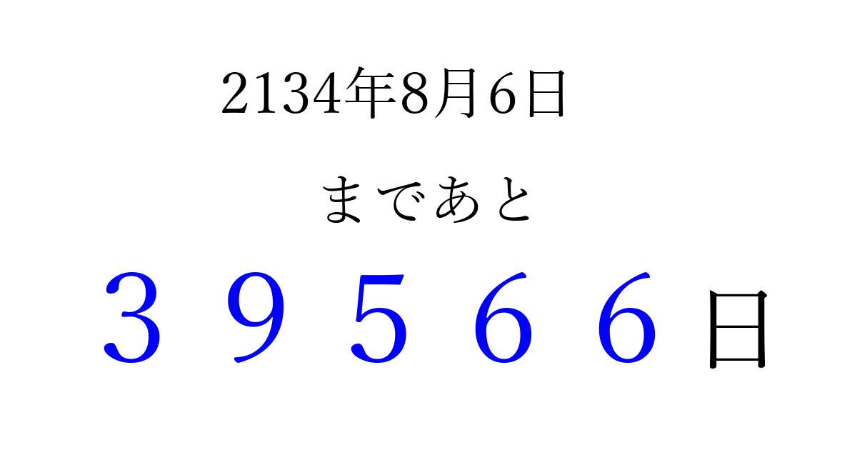 2134年8月6日(金)まで あと 99999 日です 追加すると、トップページからすぐ選べるようになります ※2026/04/08現在の結果です。 最新の状態に更新する ↓シェアして、タイムライン上にカウントダウンを表示しよう!↓ 📤 この結果を共有する Tweet シェア Threads Bluesky 別の日付でカウントダウン 2134年8月のカレンダー このページをブックマークに追加すると、いつでもカウントダウンを確認できます。 (PC: Ctrl+D / Mac: ⌘+D) hitome-notes.comでは以下のページも運営しています。 指定日と期間から日付を計算 | ガチャ確率計算・シミュレーション | プライバシー・ポリシー 運営者:Avocado