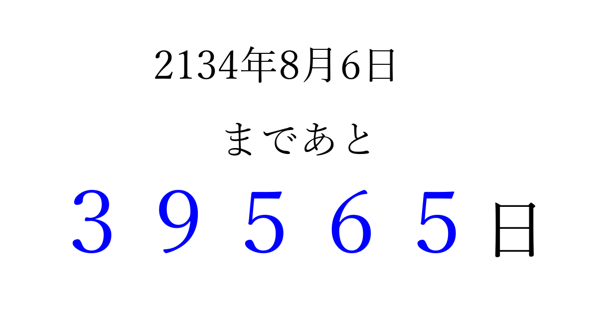 2134年8月6日(金)まで あと 99999 日です 追加すると、トップページからすぐ選べるようになります ※2026/04/09現在の結果です。 最新の状態に更新する ↓シェアして、タイムライン上にカウントダウンを表示しよう!↓ 📤 この結果を共有する Tweet シェア Threads Bluesky 別の日付でカウントダウン 2134年8月のカレンダー このページをブックマークに追加すると、いつでもカウントダウンを確認できます。 (PC: Ctrl+D / Mac: ⌘+D) hitome-notes.comでは以下のページも運営しています。 指定日と期間から日付を計算 | ガチャ確率計算・シミュレーション | プライバシー・ポリシー 運営者:Avocado