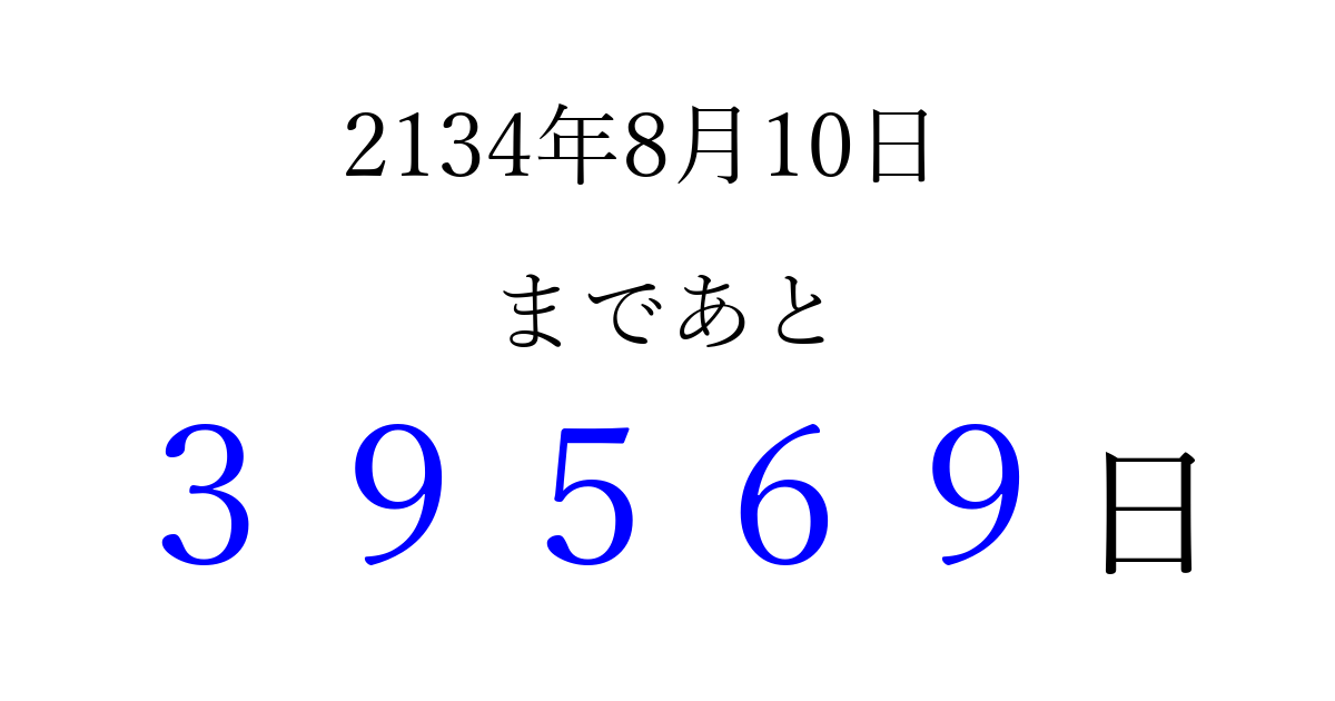 2134年8月10日(火)まで あと 99999 日です 追加すると、トップページからすぐ選べるようになります ※2026/04/09現在の結果です。 最新の状態に更新する ↓シェアして、タイムライン上にカウントダウンを表示しよう!↓ 📤 この結果を共有する Tweet シェア Threads Bluesky 別の日付でカウントダウン 2134年8月のカレンダー このページをブックマークに追加すると、いつでもカウントダウンを確認できます。 (PC: Ctrl+D / Mac: ⌘+D) hitome-notes.comでは以下のページも運営しています。 指定日と期間から日付を計算 | ガチャ確率計算・シミュレーション | プライバシー・ポリシー 運営者:Avocado