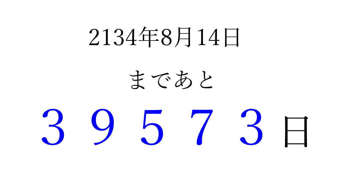 2134年8月14日(土)まで あと 99999 日です 追加すると、トップページからすぐ選べるようになります ※2026/04/09現在の結果です。 最新の状態に更新する ↓シェアして、タイムライン上にカウントダウンを表示しよう!↓ 📤 この結果を共有する Tweet シェア Threads Bluesky 別の日付でカウントダウン 2134年8月のカレンダー このページをブックマークに追加すると、いつでもカウントダウンを確認できます。 (PC: Ctrl+D / Mac: ⌘+D) hitome-notes.comでは以下のページも運営しています。 指定日と期間から日付を計算 | ガチャ確率計算・シミュレーション | プライバシー・ポリシー 運営者:Avocado