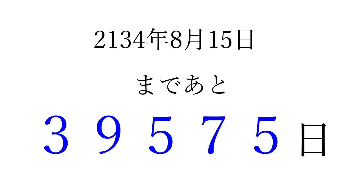 2134年8月15日(日)まで あと 99999 日です 追加すると、トップページからすぐ選べるようになります ※2026/04/08現在の結果です。 最新の状態に更新する ↓シェアして、タイムライン上にカウントダウンを表示しよう!↓ 📤 この結果を共有する Tweet シェア Threads Bluesky 別の日付でカウントダウン 2134年8月のカレンダー このページをブックマークに追加すると、いつでもカウントダウンを確認できます。 (PC: Ctrl+D / Mac: ⌘+D) hitome-notes.comでは以下のページも運営しています。 指定日と期間から日付を計算 | ガチャ確率計算・シミュレーション | プライバシー・ポリシー 運営者:Avocado