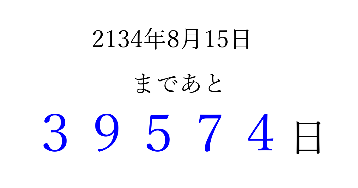 2134年8月15日(日)まで あと 99999 日です 追加すると、トップページからすぐ選べるようになります ※2026/04/09現在の結果です。 最新の状態に更新する ↓シェアして、タイムライン上にカウントダウンを表示しよう!↓ 📤 この結果を共有する Tweet シェア Threads Bluesky 別の日付でカウントダウン 2134年8月のカレンダー このページをブックマークに追加すると、いつでもカウントダウンを確認できます。 (PC: Ctrl+D / Mac: ⌘+D) hitome-notes.comでは以下のページも運営しています。 指定日と期間から日付を計算 | ガチャ確率計算・シミュレーション | プライバシー・ポリシー 運営者:Avocado