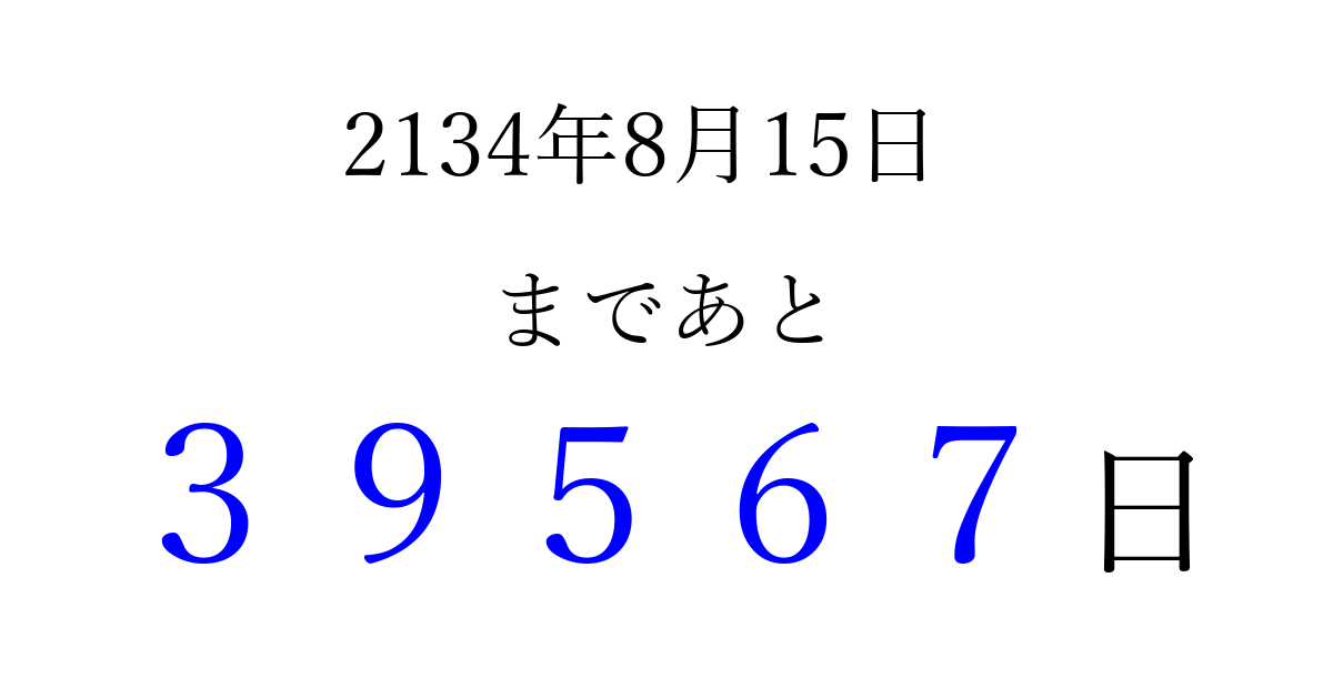 2134年8月15日(日)まで あと 99999 日です 追加すると、トップページからすぐ選べるようになります ※2026/04/16現在の結果です。 最新の状態に更新する ↓シェアして、タイムライン上にカウントダウンを表示しよう!↓ 📤 この結果を共有する Tweet シェア Threads Bluesky 別の日付でカウントダウン 2134年8月のカレンダー このページをブックマークに追加すると、いつでもカウントダウンを確認できます。 (PC: Ctrl+D / Mac: ⌘+D) hitome-notes.comでは以下のページも運営しています。 指定日と期間から日付を計算 | ガチャ確率計算・シミュレーション | プライバシー・ポリシー 運営者:Avocado
