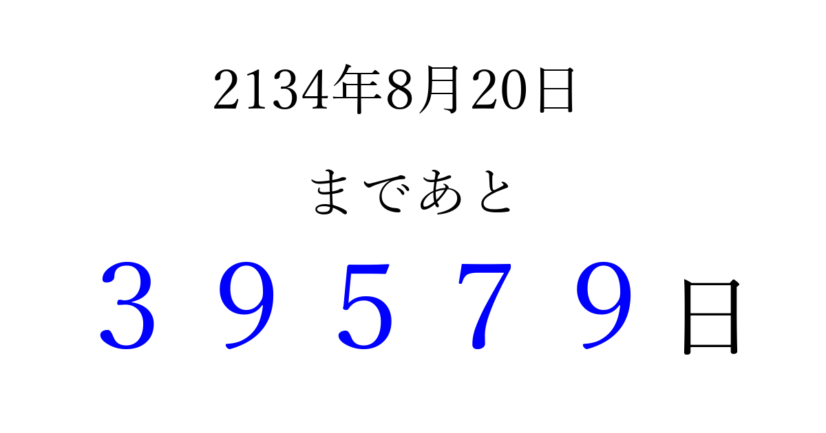 2134年8月20日(金)まで あと 99999 日です 追加すると、トップページからすぐ選べるようになります ※2026/04/09現在の結果です。 最新の状態に更新する ↓シェアして、タイムライン上にカウントダウンを表示しよう!↓ 📤 この結果を共有する Tweet シェア Threads Bluesky 別の日付でカウントダウン 2134年8月のカレンダー このページをブックマークに追加すると、いつでもカウントダウンを確認できます。 (PC: Ctrl+D / Mac: ⌘+D) hitome-notes.comでは以下のページも運営しています。 指定日と期間から日付を計算 | ガチャ確率計算・シミュレーション | プライバシー・ポリシー 運営者:Avocado