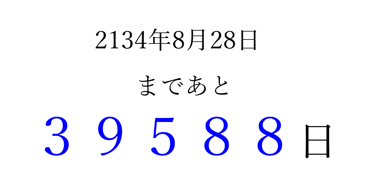 2134年8月28日(土)まで あと 99999 日です 追加すると、トップページからすぐ選べるようになります ※2026/04/08現在の結果です。 最新の状態に更新する ↓シェアして、タイムライン上にカウントダウンを表示しよう!↓ 📤 この結果を共有する Tweet シェア Threads Bluesky 別の日付でカウントダウン 2134年8月のカレンダー このページをブックマークに追加すると、いつでもカウントダウンを確認できます。 (PC: Ctrl+D / Mac: ⌘+D) hitome-notes.comでは以下のページも運営しています。 指定日と期間から日付を計算 | ガチャ確率計算・シミュレーション | プライバシー・ポリシー 運営者:Avocado
