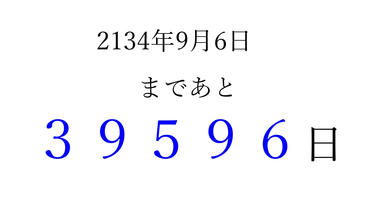 2134年9月6日(月)まで あと 99999 日です 追加すると、トップページからすぐ選べるようになります ※2026/04/09現在の結果です。 最新の状態に更新する ↓シェアして、タイムライン上にカウントダウンを表示しよう!↓ 📤 この結果を共有する Tweet シェア Threads Bluesky 別の日付でカウントダウン 2134年9月のカレンダー このページをブックマークに追加すると、いつでもカウントダウンを確認できます。 (PC: Ctrl+D / Mac: ⌘+D) hitome-notes.comでは以下のページも運営しています。 指定日と期間から日付を計算 | ガチャ確率計算・シミュレーション | プライバシー・ポリシー 運営者:Avocado
