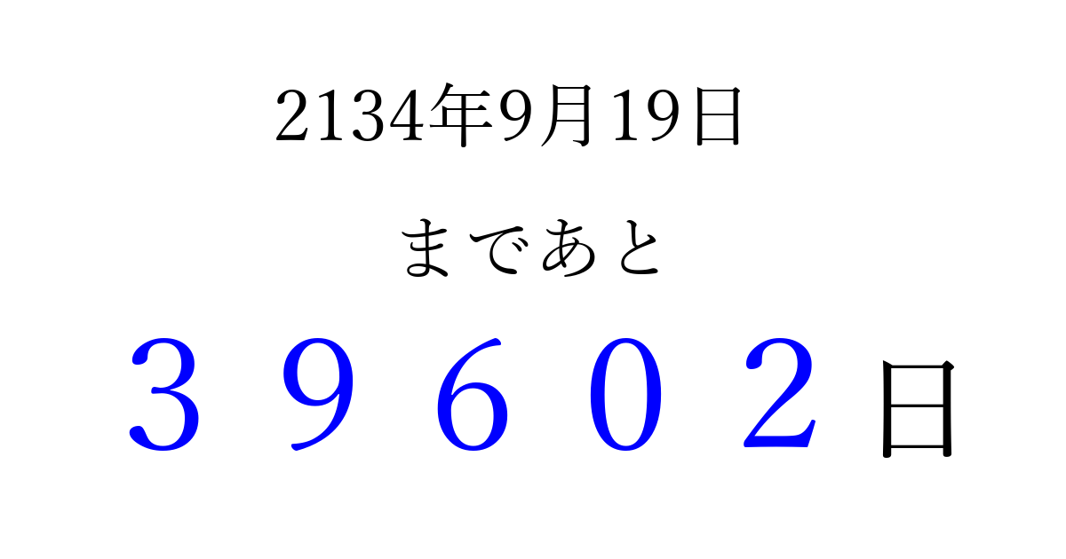 2134年9月19日(日)まで あと 99999 日です 追加すると、トップページからすぐ選べるようになります ※2026/04/16現在の結果です。 最新の状態に更新する ↓シェアして、タイムライン上にカウントダウンを表示しよう!↓ 📤 この結果を共有する Tweet シェア Threads Bluesky 別の日付でカウントダウン 2134年9月のカレンダー このページをブックマークに追加すると、いつでもカウントダウンを確認できます。 (PC: Ctrl+D / Mac: ⌘+D) hitome-notes.comでは以下のページも運営しています。 指定日と期間から日付を計算 | ガチャ確率計算・シミュレーション | プライバシー・ポリシー 運営者:Avocado