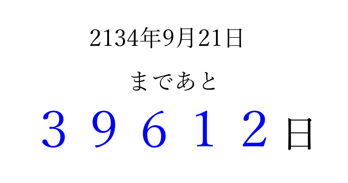 2134年9月21日(火)まで あと 99999 日です 追加すると、トップページからすぐ選べるようになります ※2026/04/08現在の結果です。 最新の状態に更新する ↓シェアして、タイムライン上にカウントダウンを表示しよう!↓ 📤 この結果を共有する Tweet シェア Threads Bluesky 別の日付でカウントダウン 2134年9月のカレンダー このページをブックマークに追加すると、いつでもカウントダウンを確認できます。 (PC: Ctrl+D / Mac: ⌘+D) hitome-notes.comでは以下のページも運営しています。 指定日と期間から日付を計算 | ガチャ確率計算・シミュレーション | プライバシー・ポリシー 運営者:Avocado